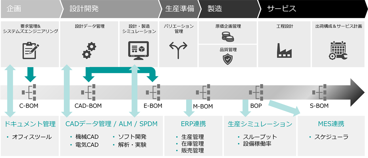 BOM情報を中心に各種システムを連携させることで、設計から生産、サービスまでの情報フローをシームレスにつなぎ、全社的なデータ活用や業務効率化を実現します。