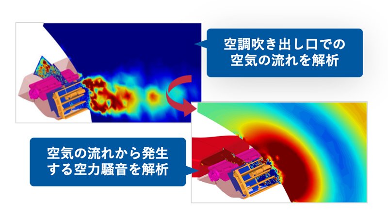 エアコンの吹き出し口での空気の流れと発生する空力騒音を解析。空調ダクト形状が騒音に及ぼす影響を予測し、騒音低減につなげます。