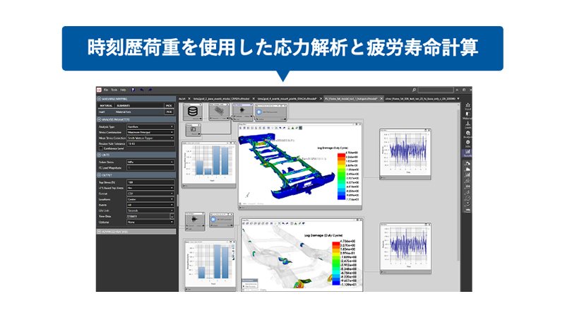機構解析との連携により得られる、実稼働状態を再現した荷重より計算された応力/ひずみの情報に基づき、車体/コンポーネントの疲労寿命を予測します。