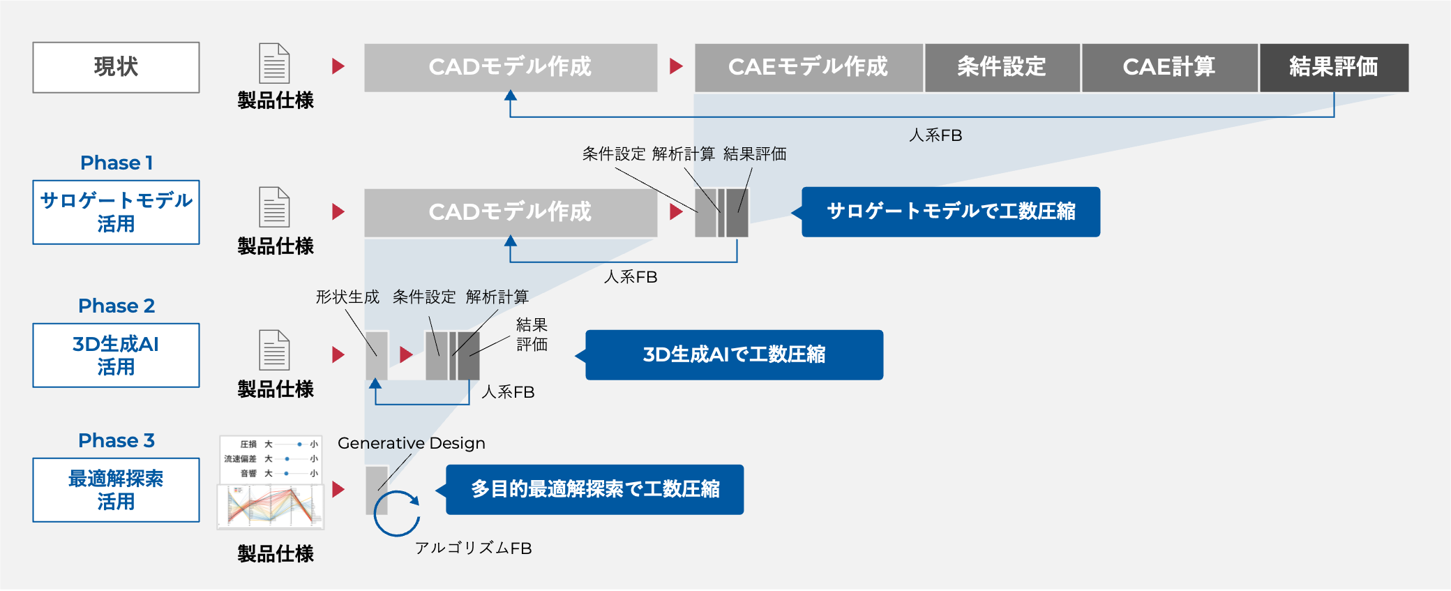 AI技術とエンジニアリング技術を融合することで、設計・解析業務を自動化・効率化して、スピード向上。サロゲートモデル、3D生成AI、最適解探索などのAI技術を段階的に適用して解析のフロントローディングを実現するとともに、人による評価のばらつきを平準化するなど属人性を解消します。