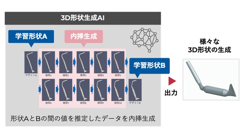 過去の製品CADデータを学習したAIモデルを構築し、要件入力に基づき新たな3D形状データを生成します。